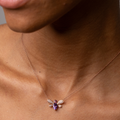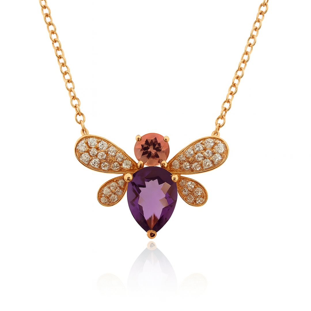 At its heart rests a beautifully faceted Pear cut Amethyst 1.10ct, round cut Pink Tourmaline 0.30ct & The wings with brilliant diamonds 0.20ct.