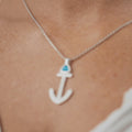 The Classic Anchor Pendant features a Bermuda Blue Cats Eye, exclusively at Davidrose. Setting is Sterling Silver finished with Rhodium to prevent tarnishing.