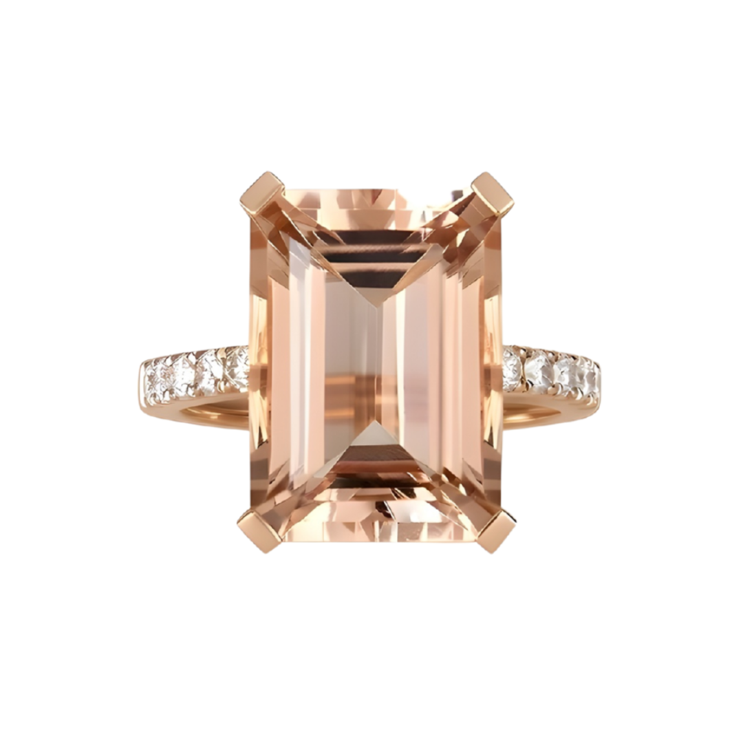 Light up every room with this cocktail ring, while absorbing the healing qualities of the large emerald cut morganite gemstone. Set in a rose gold band dotted with diamonds, this beautiful handcrafted piece is sure to be treasured.
