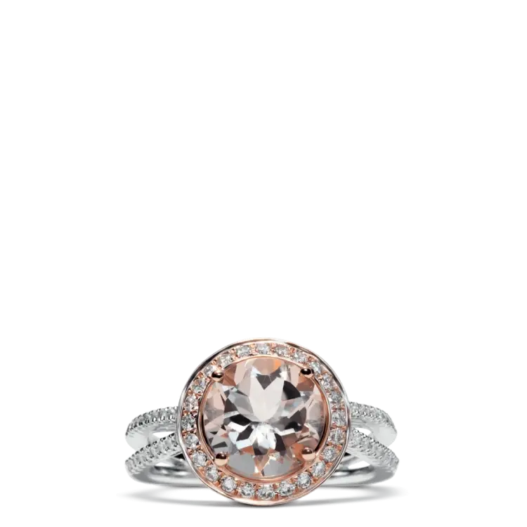 Inspired by the 13th century Persian Poet, The Rumi Ring features a Morganite encircled by a halo of diamonds set in 18K Rose Gold while the band is 18K White with diamonds.